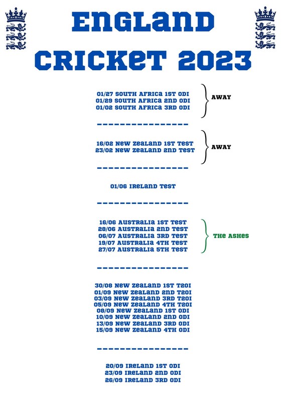 England Mens Cricket Team Fixtures 2023 Digital Download Etsy