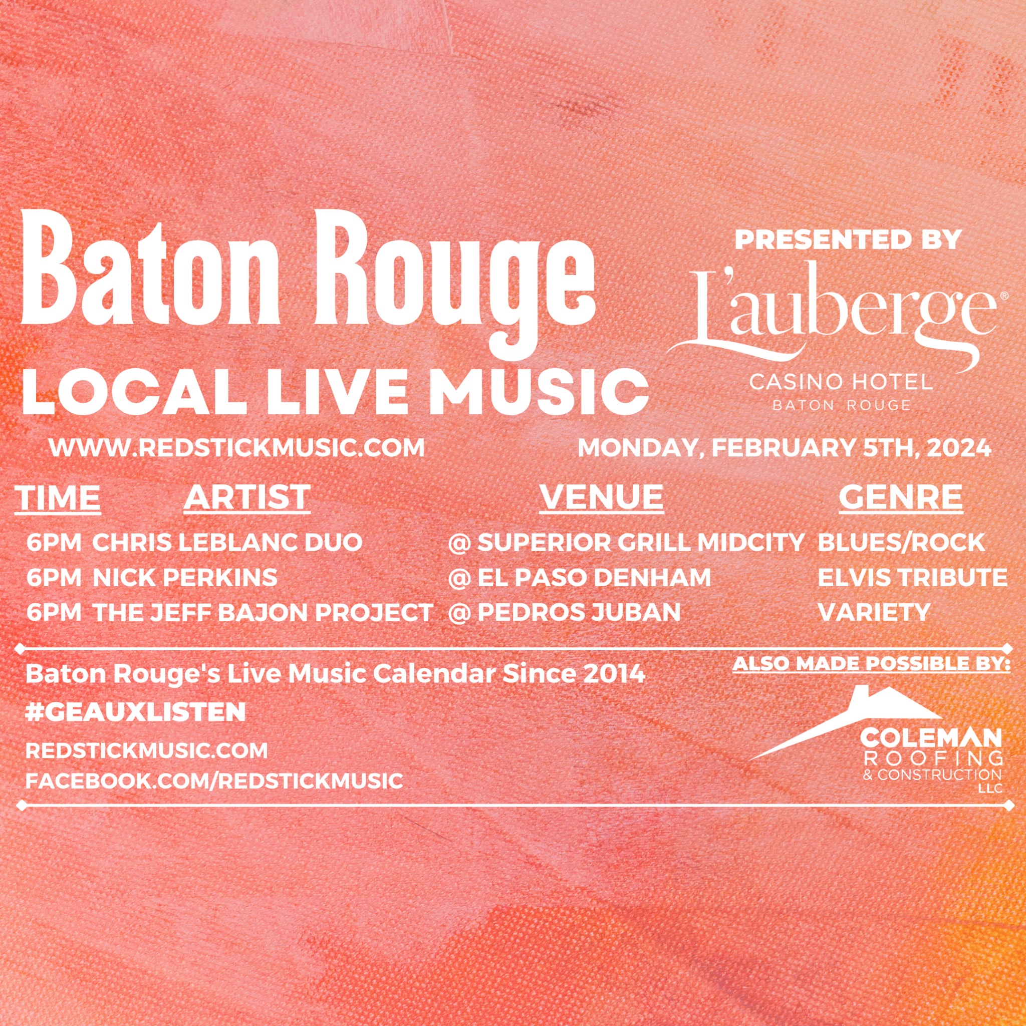Red Stick Music Calendar Baton Rouge’s Live Music Calendar | Red Stick Music: Local indie-rock band Red Dakota was originally formed by self-taught musicians Alyssa and Derek Terry, who set out to make music to satisfy their own creative itch, later adding like-minded members . (WAFB) – The Red Stick Cannabis Street Fair is taking over Live Stage Performances and DJ Sets: Groove to the rhythm of live music and DJ mixes, adding an extra layer of excitement to the .